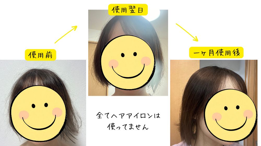 使った翌日から、アホ毛が抑えられている気がしましたが、一ヶ月の継続利用でやはりかなりマシになっていると感じます。手触りも変わり、髪を手ぐしで整えるときも、ゴワゴワした感じはなくなり、スルンと指通りがよくなりました。(※個人の感想です)
